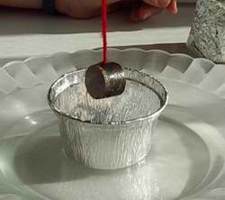 Después vamos a colgar el imán de un hilo y lo vamos a hacer girar, sobre si mismo, lo más deprisa posible (basta con retorcer el hilo).