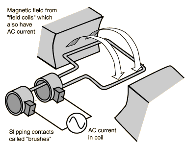 Uno de los inconvenientes de esta clase de motores de AC es la alta corriente que debe fluir por los contactos giratorios (colector). El chisporroteo y el calor en estos contactos (delgas), desperdician energía y reduce la vida útil del motor. El campo magnético en los motores comunes de AC, se produce por medio de un electroimán alimentado por el mismo voltaje de AC que las bobinas del motor. Las bobinas que producen el campo magnético son referidas como el "estator", mientras que las bobinas y el núcleo sólido que gira se llama "rotor". En el motor de AC, el campo magnético varía sinusoidalmente al igual que la corriente en las bobinas.El giro de una bobina en un campo magnético, produce una fem inducida en ambos lados de la bobina. Como la componente de la velocidad perpendicular al campo magnético, cambia sinusoidalmente con la rotación, el voltaje generado es sinusoidal o voltaje AC. Este proceso se puede describir en términos de la ley de Faraday, cuando se observa que la rotación de la bobina cambia continuamente el flujo magnético a través de la bobina, y por tanto genera un voltaje.